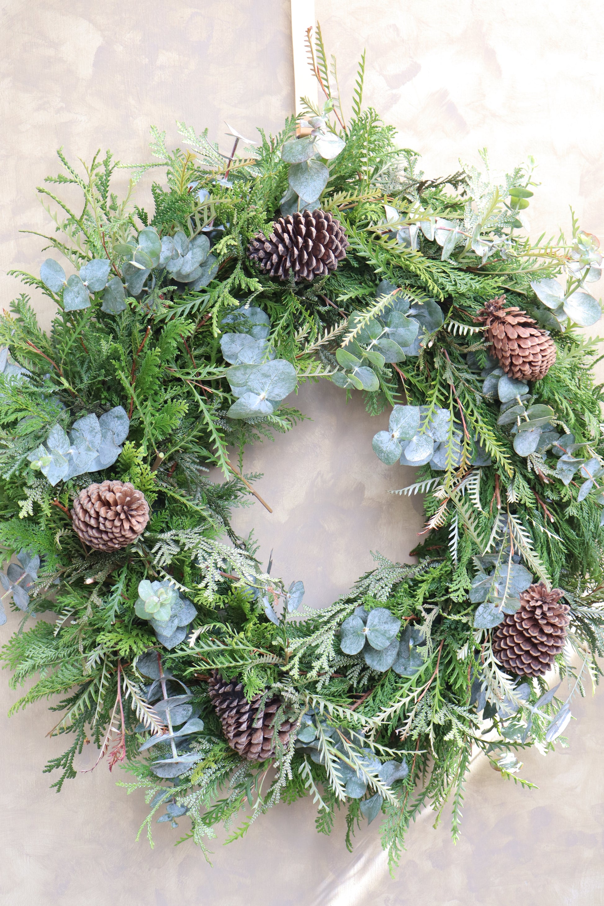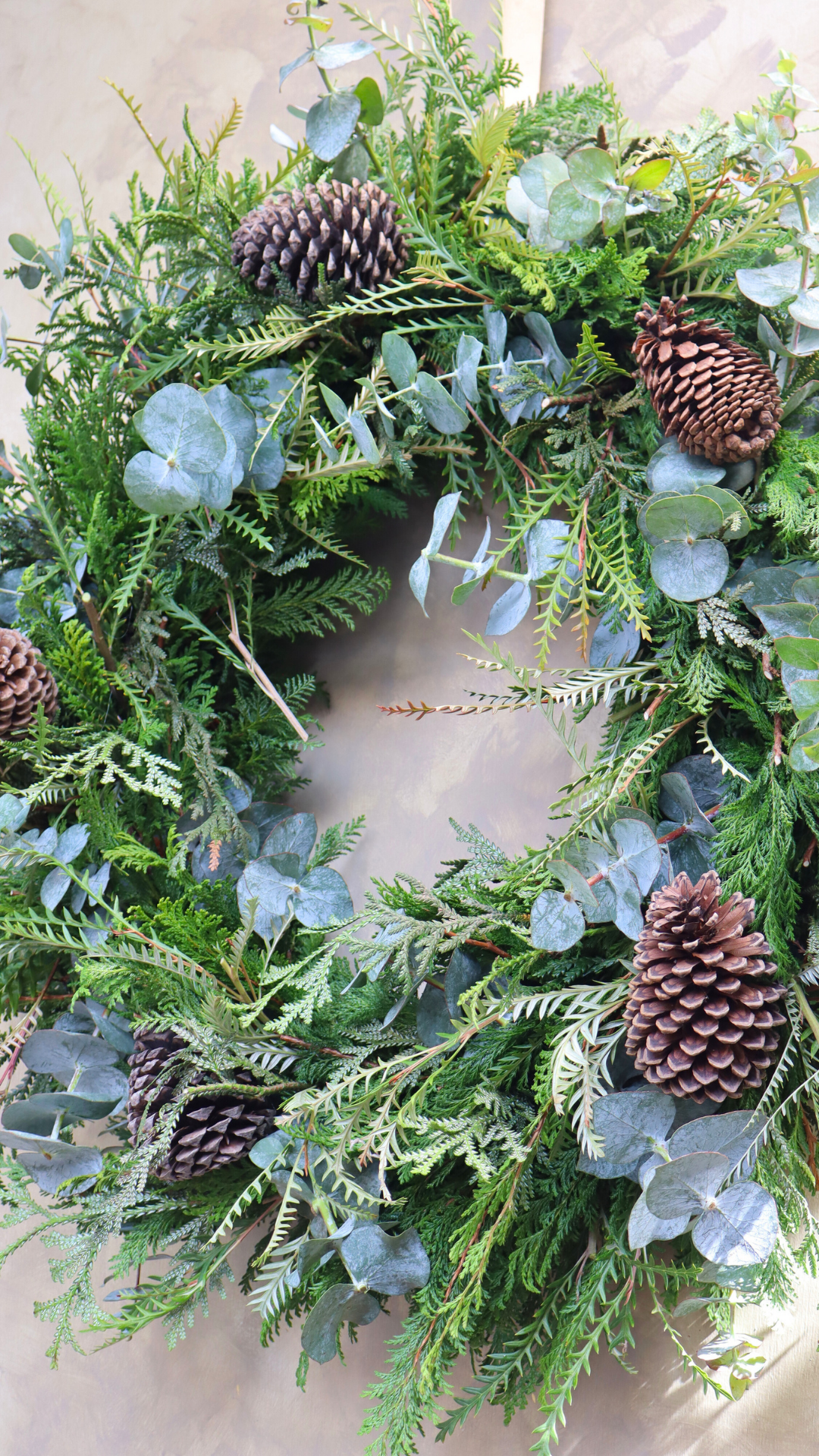 Nuestra Corona Natural Grande de Pino y Follajes con Piñas es una pieza espectacular y llena de esencia navideña.