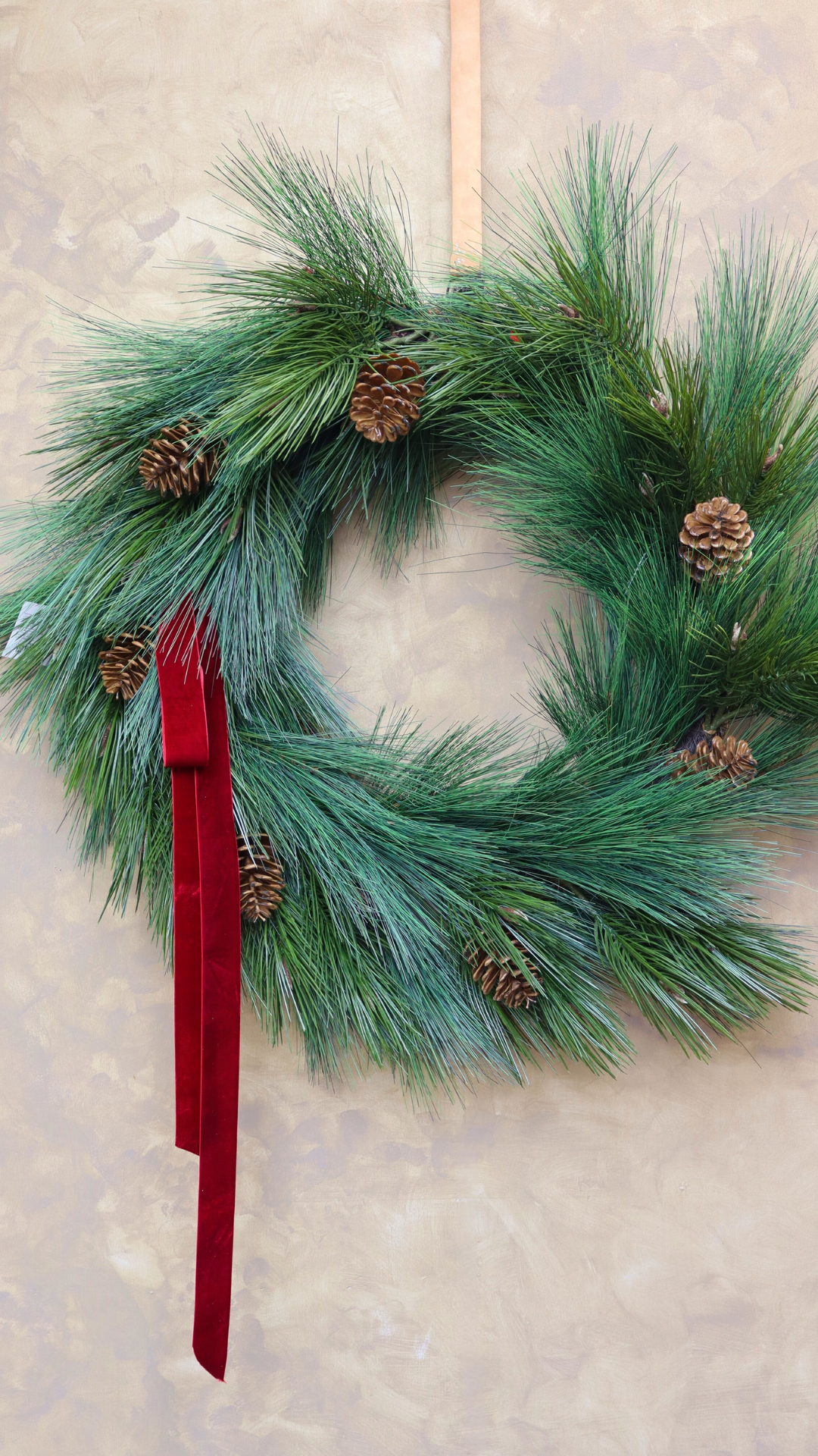 Nuestra Corona de Pino Artificial con Piñas es una pieza grande, llamativa y perfecta para vestir tu hogar con el espíritu navideño.